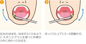 歯ブラシのヘッドの背で、頬内側を上から下に3~5回ゆっくり引き伸ばしてください。