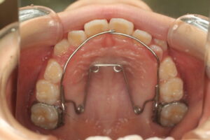 上の3番目の歯 糸切り歯・犬歯が生えてくるときに、 スペース不足になりそうでした。 この時に一時的に上にクワードヘリックスという歯に、 固定するワイヤー装置を入れました。 三年後の写真↓