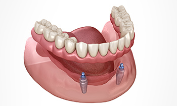 顎骨にインプラント体(人工歯根)を埋め込み、インプラント体を土台として入れ歯を固定する方法です。片顎につき2~6本のインプラント体で済むため、全てをインプラント体で行うインプラント治療よりも経済的な負担が少ないです。安定感も高くしっかりと噛めるため、快適に食事ができます。