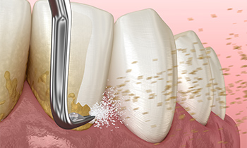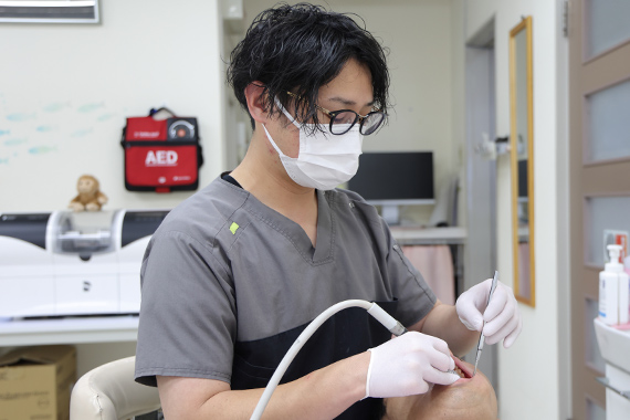スケーラーという器具を使用して、歯みがきだけでは取り除くことができない溝や隙間に溜まった歯垢や歯石を取り除きます。歯垢や歯石は細菌増殖を促し、むし歯や歯周病の原因となるため、徹底的に除去していきます。