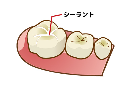 奥歯の噛み合わせ部分の溝へ、樹脂を埋め込む方法をシーラントと言います。歯垢の蓄積を防ぎ、むし歯などの予防に効果があります。