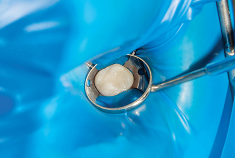 根管治療では、唾液が付着してしまうと術後の感染原因になります。そのためゴムシートを用いて、唾液の付着を防ぐ方法を取ります。
