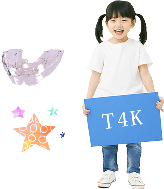 T4Kは、TRAINER FOR KIDS の頭文字をとったもので、乳歯が生えそろった(5歳から8歳頃)に矯正をする方法です。取り外し式の器具なので、学校に装置をつけていく必要もないため、お子さんへの負担が少ない治療方法です。
