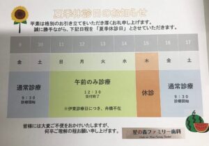 星の森ファミリー歯科では、誠に勝手ながら下記日程を夏季休診日とさせていただきます🍀