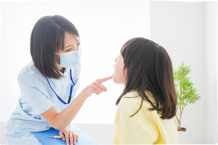 お子さんと一緒に、まずはお気軽にお越しください。お悩みやお困りごとなどがないか丁寧にお話を伺うとともに、お子さんのお口の中の状態をチェックします。