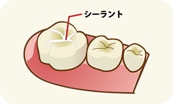 お子さんの奥歯の表面には溝があり、汚れが溜まりやすく、歯みがきで落としにくいことからむし歯の原因になってしまいます。シーラントと呼ばれる歯科用プラスチックでこの溝を埋めることで、汚れが溜まりにくく、ブラッシングで汚れを落としやすい状態にします。