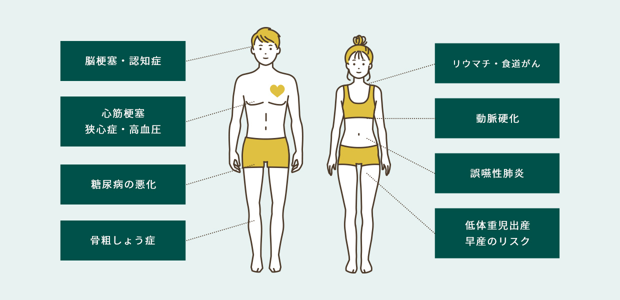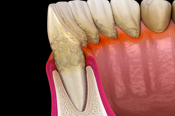 歯ぐきや顎骨など、歯の周辺組織に炎症が起きることを歯周病と呼びます。歯周病は初期段階では自覚症状がなく、気づかないかたがほとんどです。進行してしまうと歯ぐきが腫れる、顎骨が減る、歯がぐらつくなどの症状が出て、最終的に歯が抜け落ちてしまいます。口腔内に違和感があれば、お早めに当院までご相談ください。